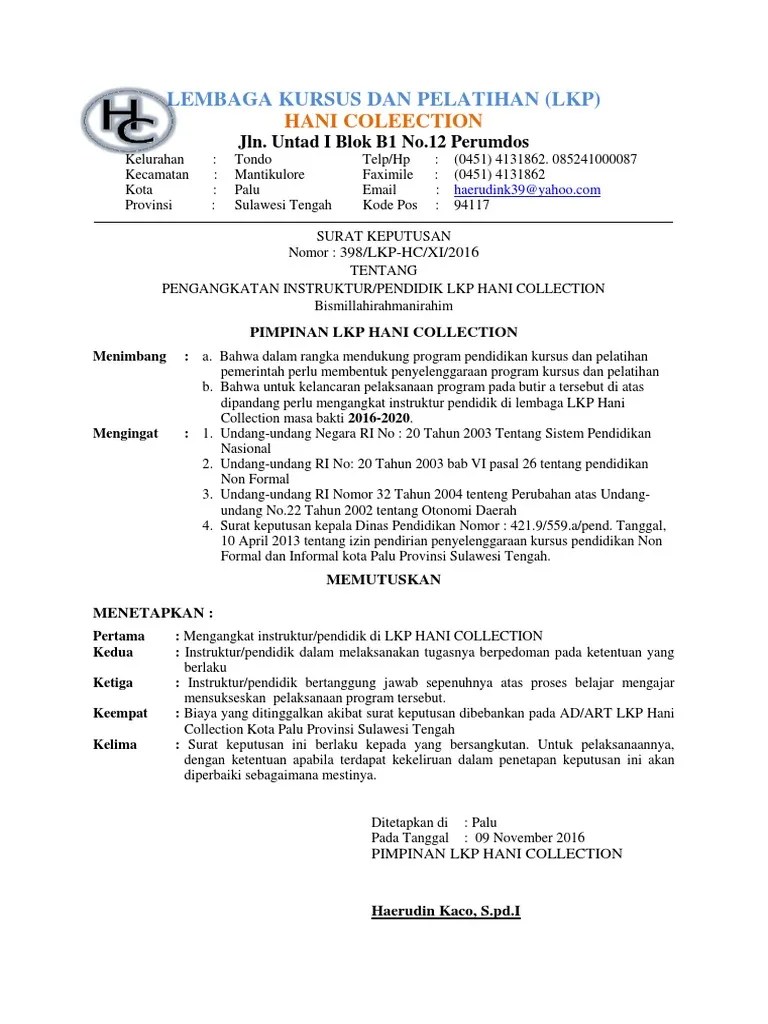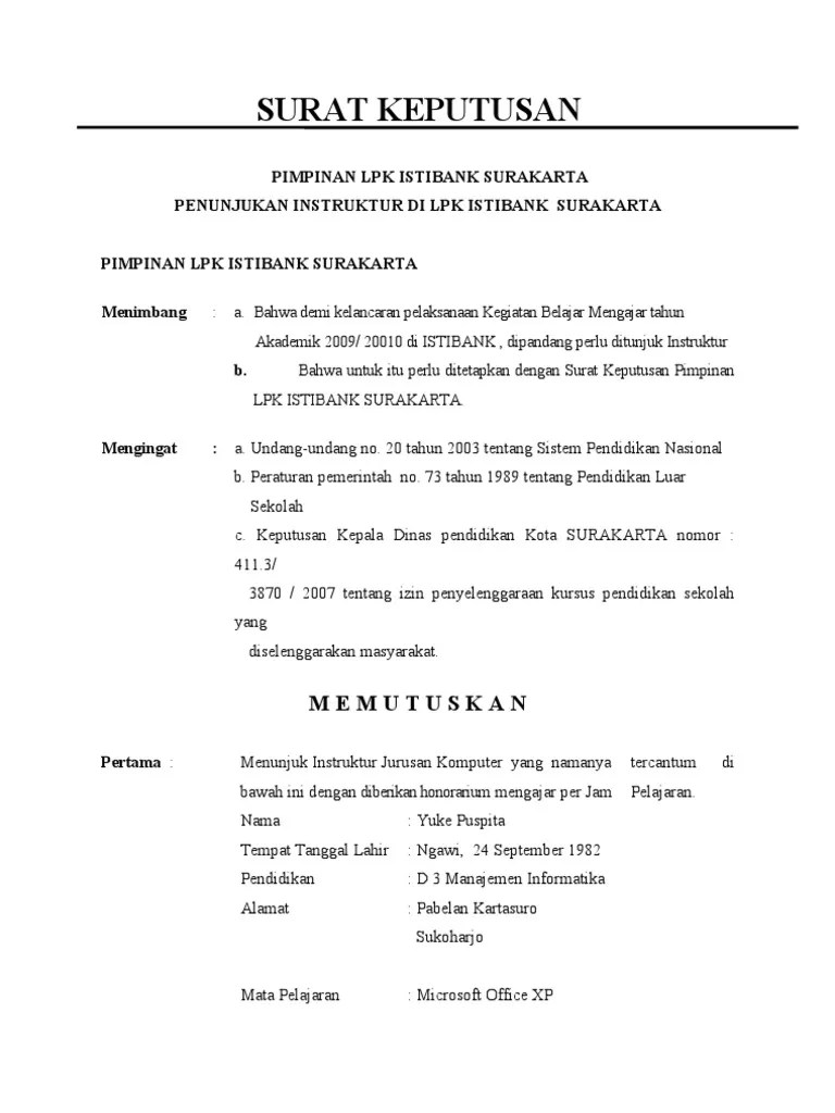 Contoh Sk Mengajar Di Lembaga Kursus Komputer : Sk Pendirian Lembaga Multi Komputer Lkp Multi Komputer Facebook - Selanjutnya kepala sekolah menerbitkan surat keputusan.